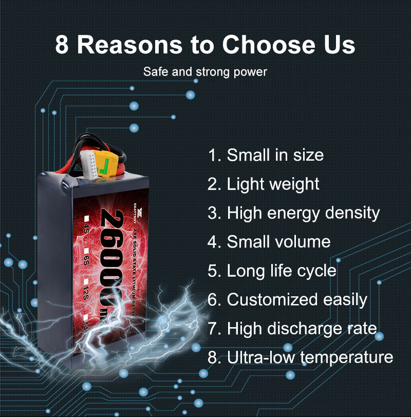 अत्याधुनिक तंत्रज्ञान: आमच्या सॉलिड-स्टेट बॅटरी बॅटरी तंत्रज्ञानाच्या नवीनतम प्रगतीचे प्रतिनिधित्व करतात, उत्कृष्ट कामगिरी आणि सुरक्षिततेसह, यासहउच्च उर्जा घनता 22 एएच 20 एएच 22000 एमएएच 10 सी 20 सी सॉलिड स्टेट ली-आयन बॅटरी पॅक लांब श्रेणी ड्रोनसाठी.